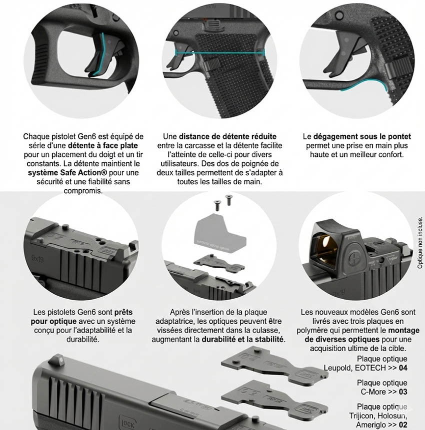 La détente droite conserve les trois sécurités emblématiques du système Safe Action, tout en proposant une cassure plus nette et un design épuré, typique des dernières évolutions Glock. Un extracteur redessiné libère de l’espace à l’arrière de la culasse afin d’améliorer l’intégration des optiques.